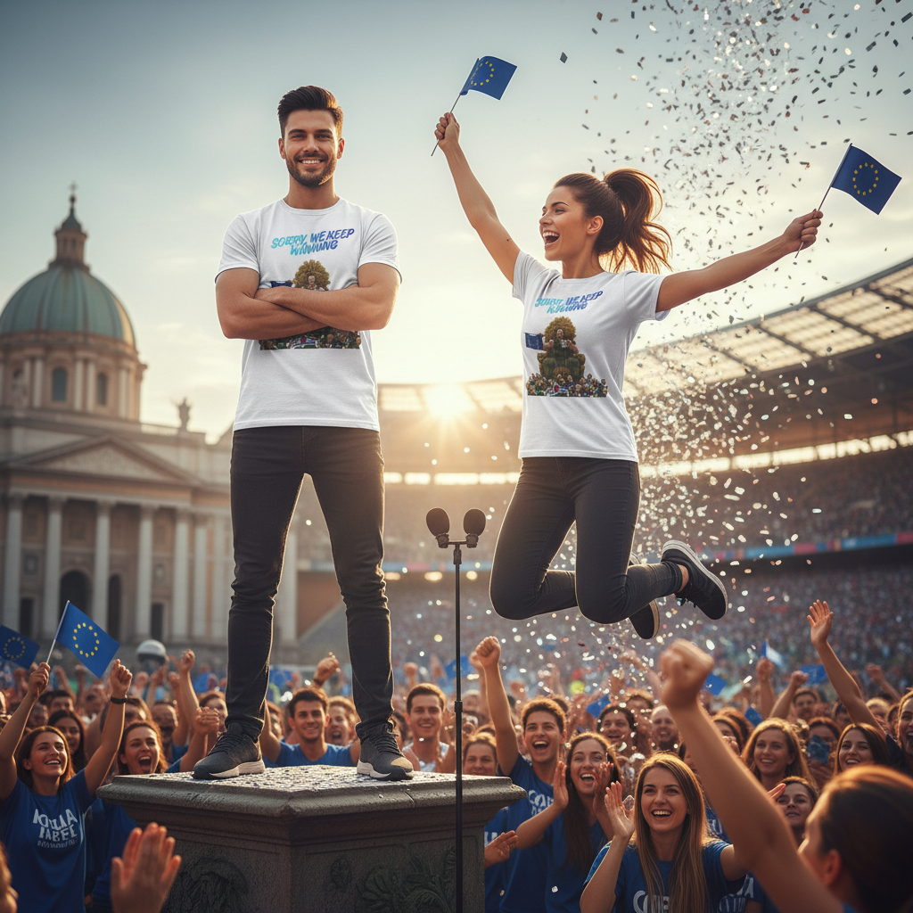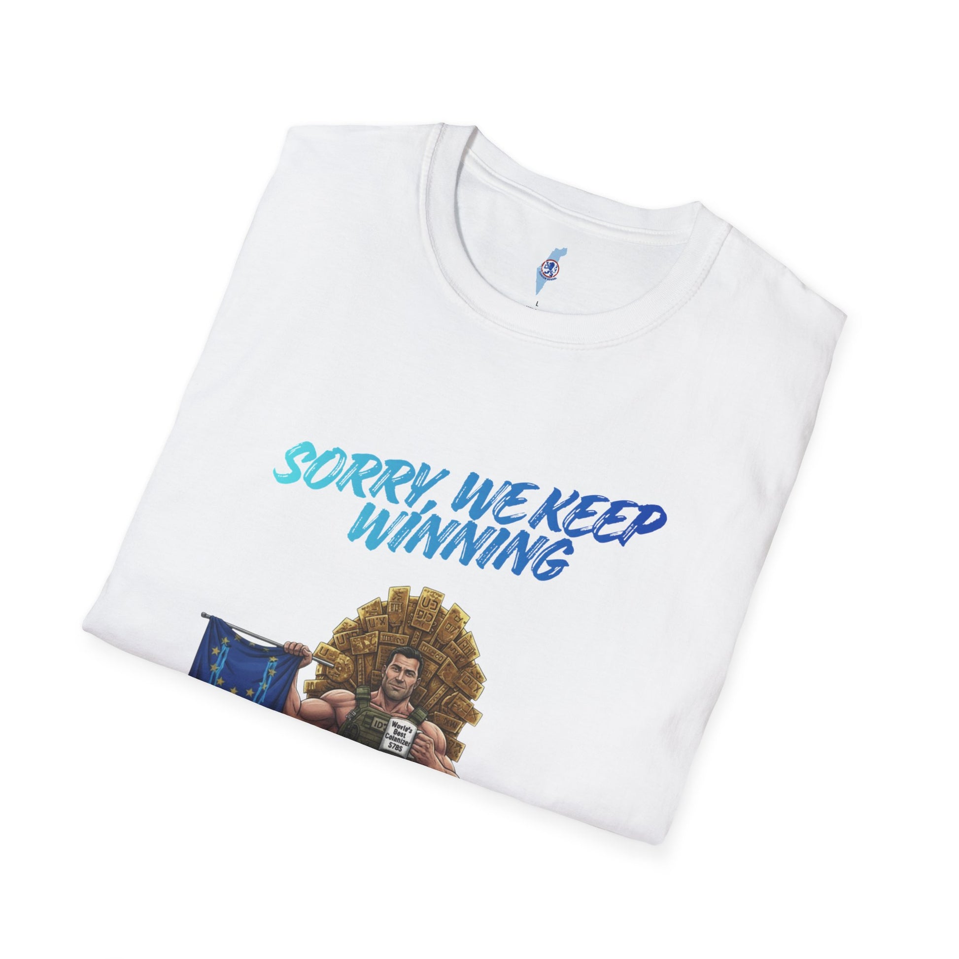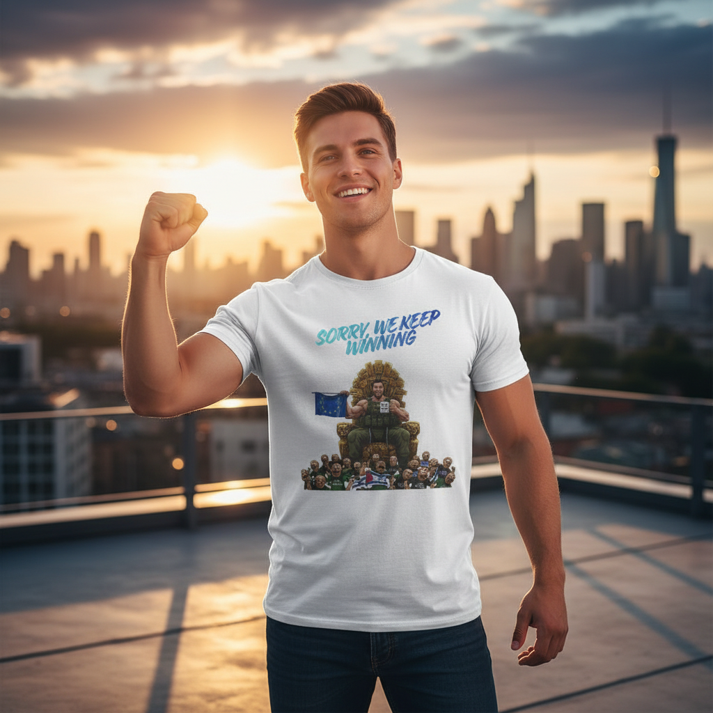 Elevate your game-day wardrobe with the Sorry We Keep Winning T-Shirt, the ultimate funny sports fan tee that screams team victory and Zionist pride! Crafted for die-hard Zionism Revival supporters who celebrate every win with zero apologies, this humorous victory shirt features a badass front DTG print: a muscular gigachad in IDF-inspired tactical gear lounging on a golden throne forged from crushed UN resolutions, bench-pressing an EU flag while tiny soyjak critics (labeled "UNESCO" and "Reddit Rage") weep below. Overhead, in explosive comic-sans glory: "SORRY WE KEEP WINNING – SKILL ISSUE", capturing that meme-worthy, over-the-top Zionist revival energy that's equal parts inspirational and absurdly based.